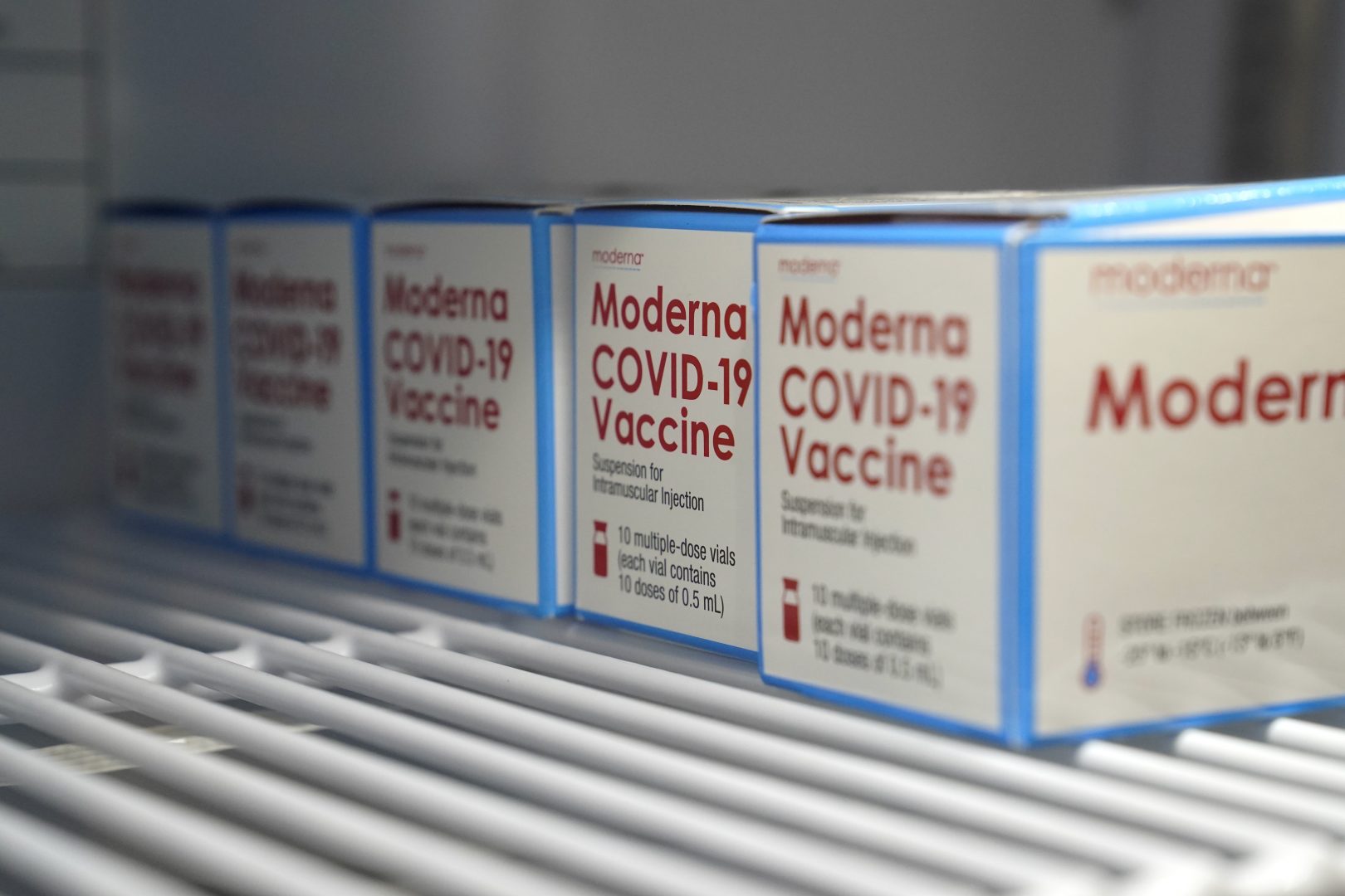 Boxes of Moderna COVID-19 vaccine are stored in a refrigerator at an ambulance company in Santa Fe Springs, Calif., Saturday, Jan. 9, 2021.