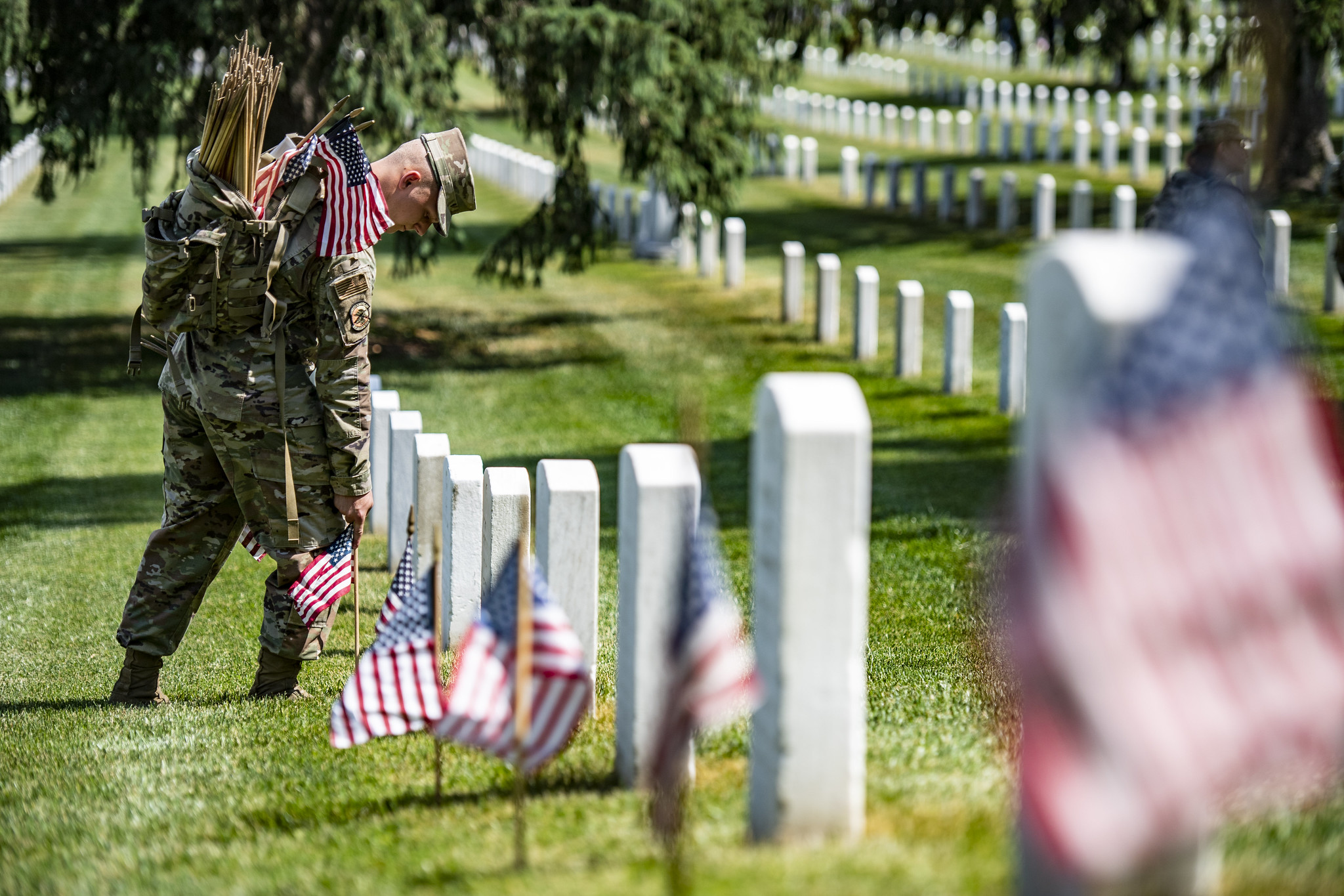 An airman assists in placing over 265,000 U.S. flags at every gravesite, columbarium court column, and niche wall column as part of Flags-In at Arlington National Cemetery, Arlington, Virginia, May 27, 2021.
