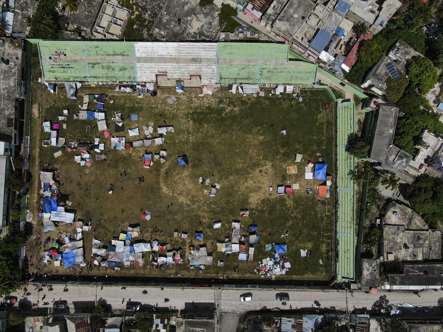 Residents whose homes were damaged during the earthquake campout at a soccer field in Les Cayes, Haiti, Monday, Aug. 16, 2021.