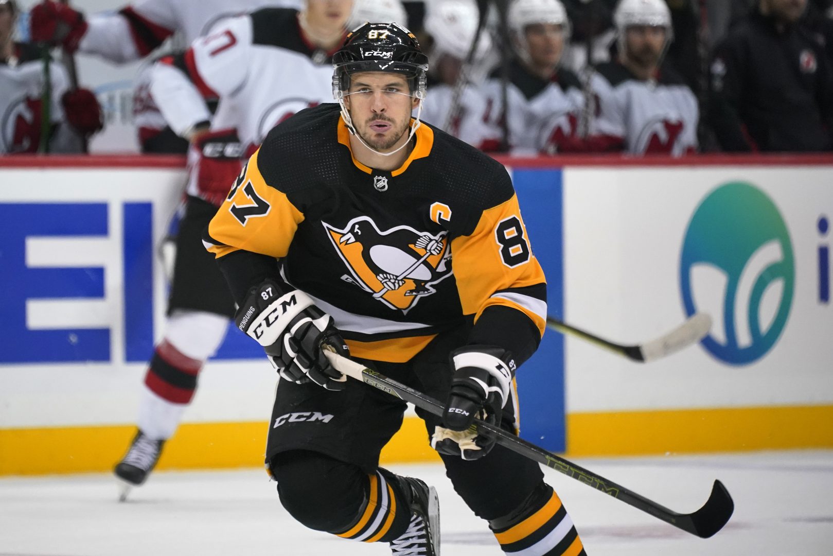 Pittsburgh Penguins' Sidney Crosby (87) skates during the second period of the team's NHL hockey game against the New Jersey Devils in Pittsburgh, Saturday, Oct. 30, 2021. It is Crosby's first game this season, after his recovery from wrist surgery. (AP Photo/Gene J. Puskar)