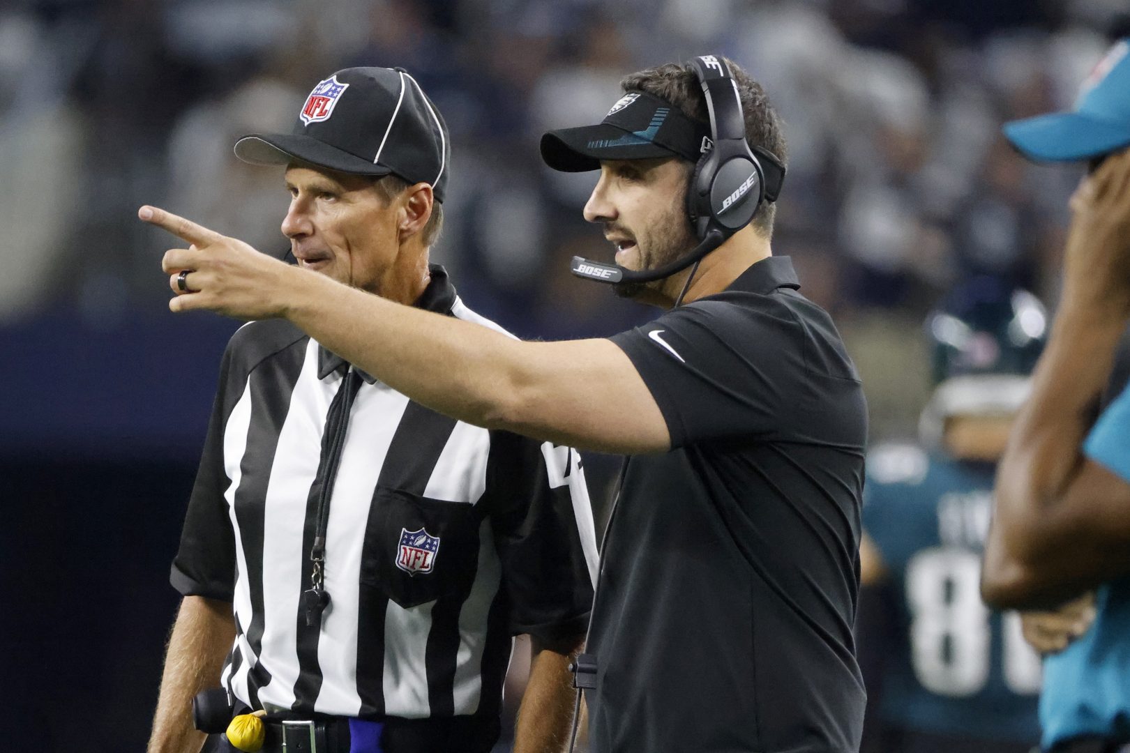 Philadelphia Eagles head coach Nick Sirianni, front, talks with an official in the first half of an NFL football game against the Dallas Cowboys in Arlington, Texas, Monday, Sept. 27, 2021.