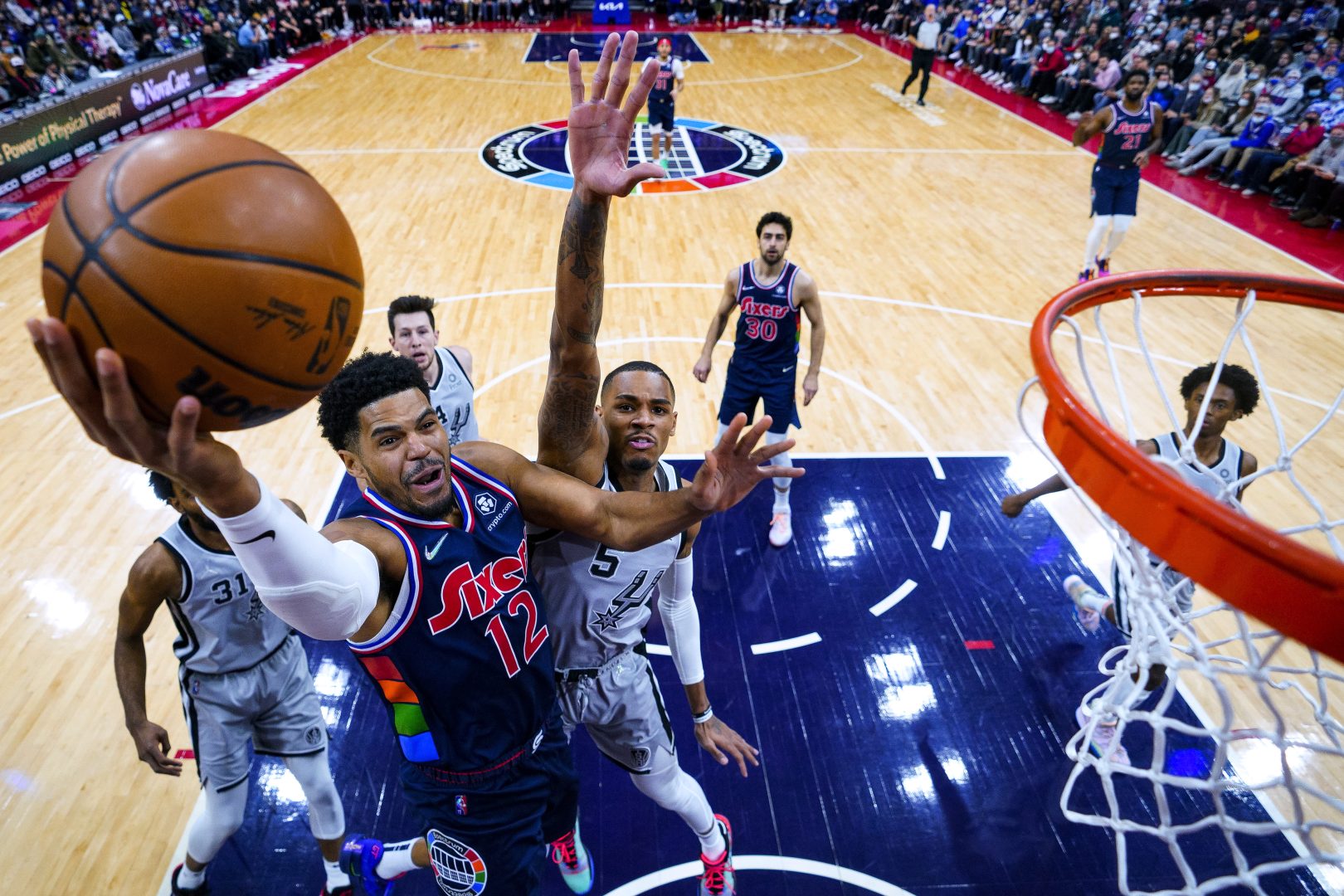 Philadelphia 76ers' Tobias Harris (12) goes up for the shot against San Antonio Spurs' Dejounte Murray, right, during the first half of an NBA basketball game Friday, Jan. 7, 2022, in Philadelphia. (AP Photo/Chris Szagola)