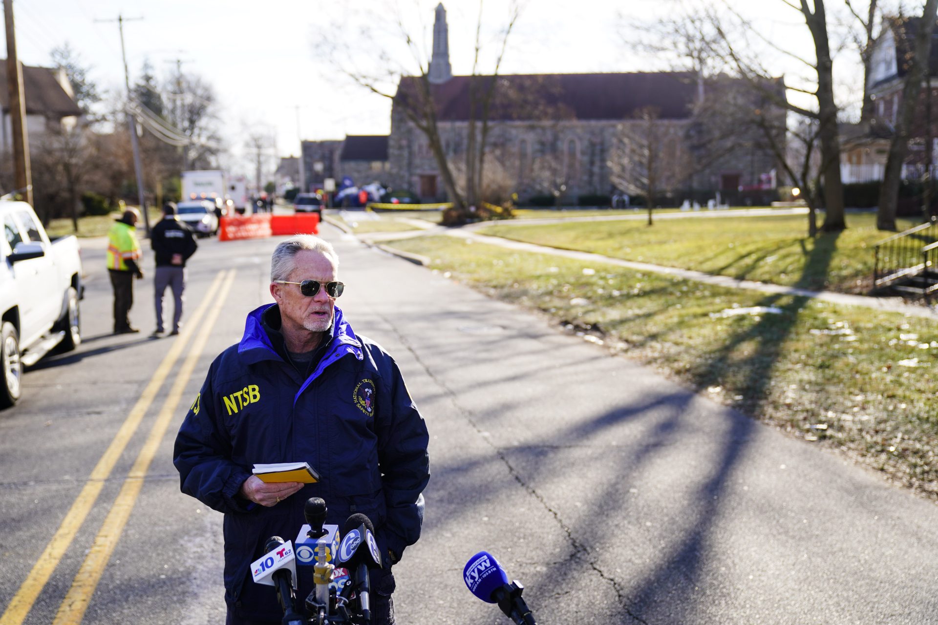Brian Rayner with the National Transportation Safety Board speaks with members of the media about a medical helicopter crash in the Drexel Hill section of Upper Darby, Pa., on Wednesday, Jan. 12, 2022. Authorities and a witness say a pilot crash landed a medical helicopter without casualties in a residential area of suburban Philadelphia, miraculously avoiding a web of power lines and buildings as the aircraft fluttered, hit the street and slid into bushes outside a church.(AP Photo/Matt Rourke)