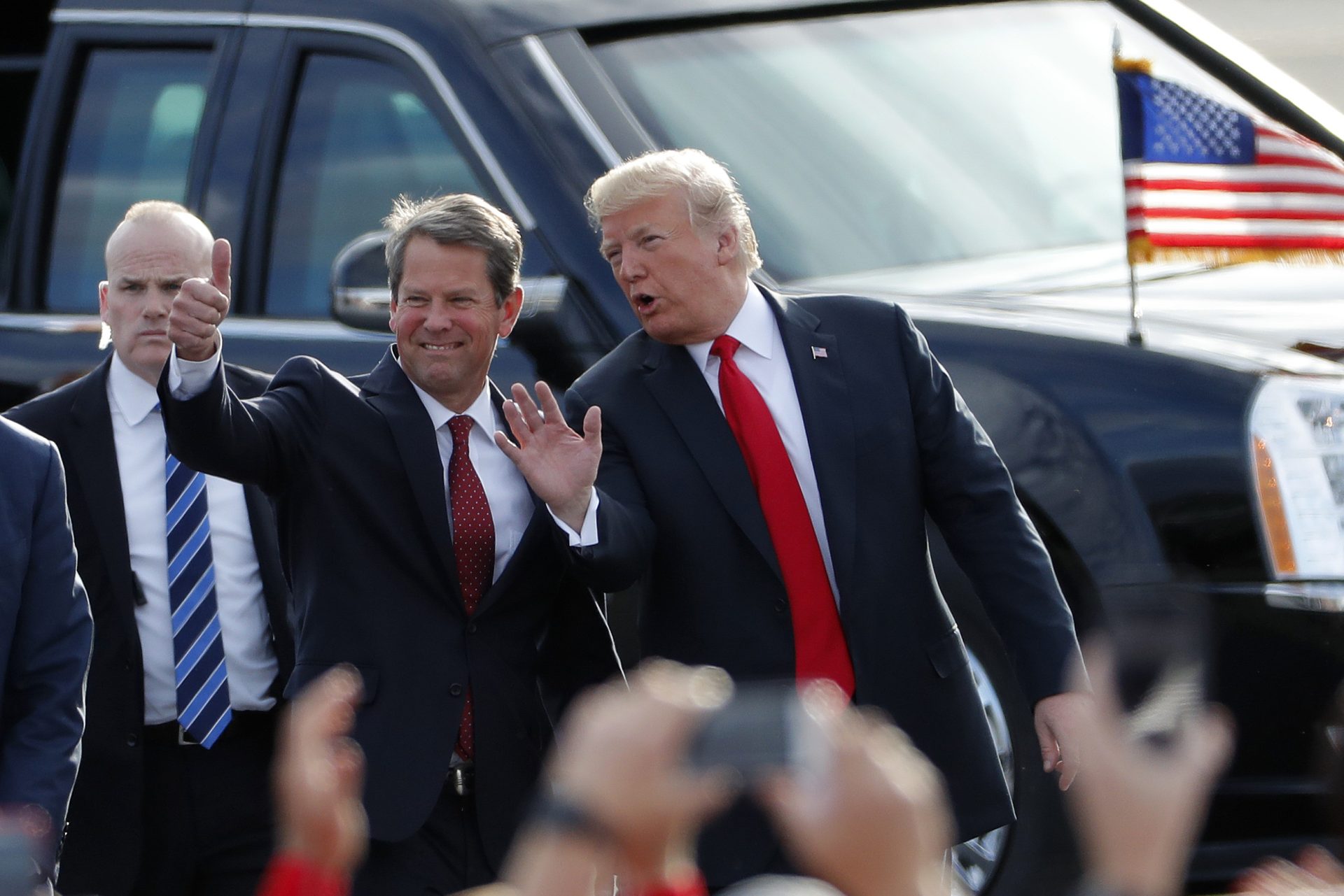 FILE – In this Nov. 4, 2018, file photo, Georgia Republican gubernatorial candidate Brian Kemp, left, walks with President Donald Trump as Trump arrives for a rally in Macon , Ga. Kemp defeated Democrat Stacey Abrams. (AP Photo/John Bazemore, File)