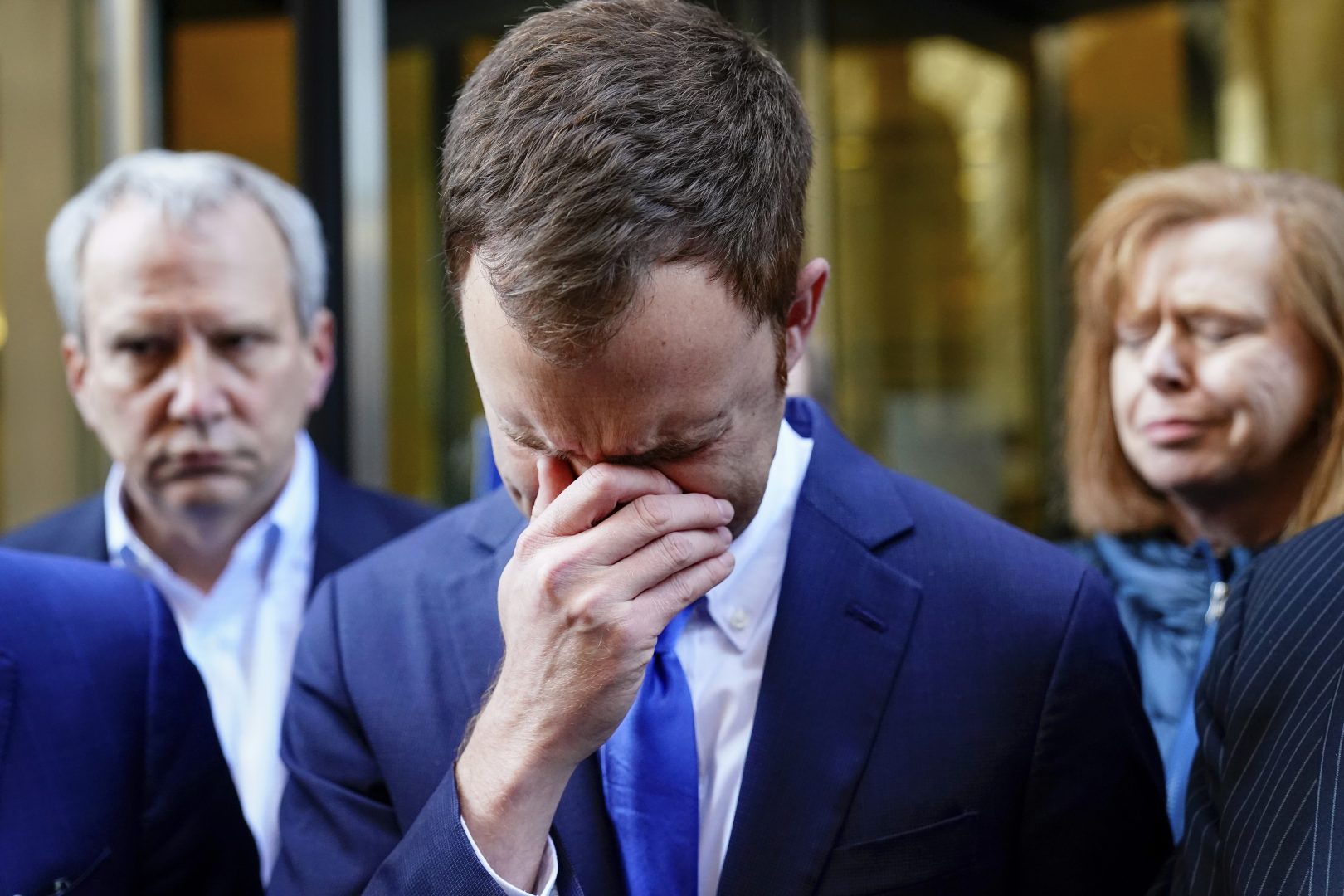 Brandon Bostian, the Amtrak engineer involved in a 2015 derailment in Philadelphia that killed eight people and injured more than 200, reacts as his attorney speaks with members of the media outside the criminal justice center in Philadelphia, Friday, March 4, 2022. A jury acquitted 38-year-old engineer Bostian of causing a catastrophe, involuntary manslaughter and reckless endangerment after a little more than an hour of deliberations. (AP Photo/Matt Rourke)