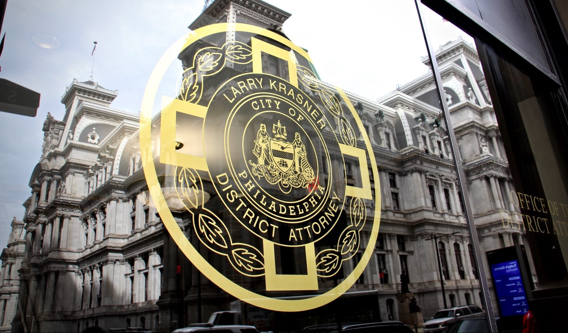 Philadelphia City Hall is reflected in the windows of the Office of the District Attorney.