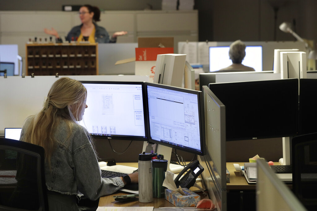 Architectural designer Erica Shannon, front, works at a computer as accounting manager Andrea Clark, top, speaks with a colleague at the design firm Bergmeyer, Wednesday, July 29, 2020, at the company’s offices, in Boston. Around the U.S,. office workers sent home when the coronavirus took hold in March are returning to the world of cubicles and conference rooms and facing certain adjustments: masks, staggered shifts, limits on how many people can be there at any one time, spaced-apart desks, daily questions about their health, closed break rooms, sanitizer everywhere.