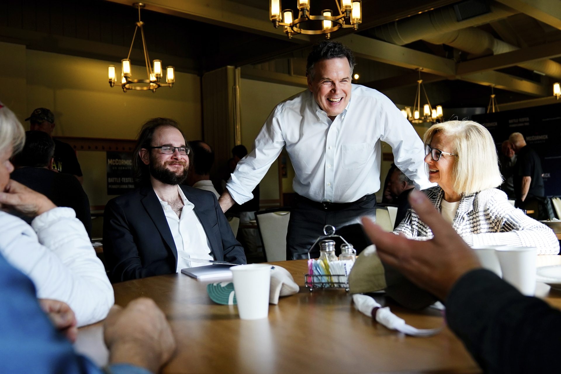FILE – Dave McCormick, a Republican candidate for U.S. Senate in Pennsylvania, meets with attendees during a campaign event in Warminster, Pa., March 7, 2022.