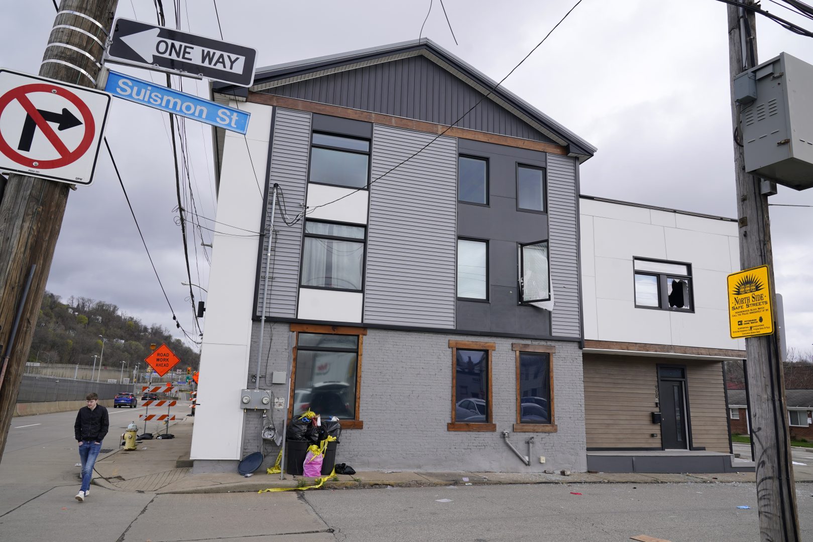 Blinds hang out of a shot out window on the second floor of the short-term rental property where police say a shooting took place in Pittsburgh early Sunday morning, April 17, 2022.