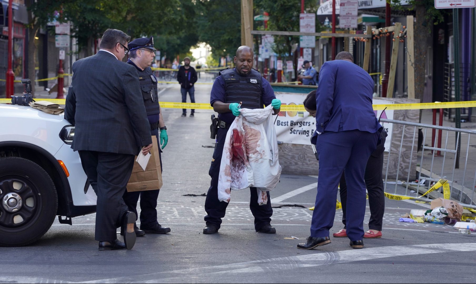 Philadelphia Police investigators work the scene of a fatal overnight shooting on South Street in Philadelphia, Sunday, June 5, 2022.