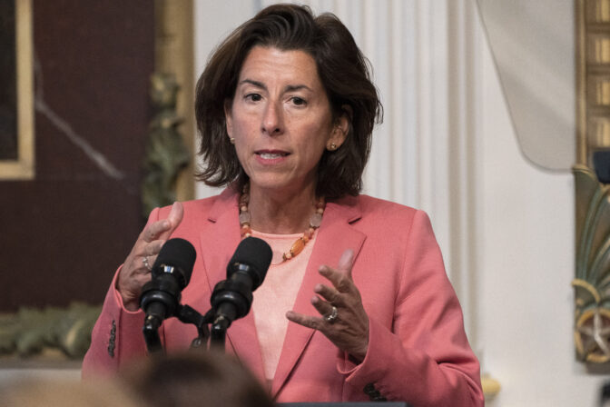 President Joe Biden looks on as Secretary of Commerce Gina Raimondo speaks before the President signs the "CHIPS and Science Act of 2022" during a ceremony on the South Lawn of the White House, Tuesday, Aug. 9, 2022, in Washington. (AP Photo/Carolyn Kaster)