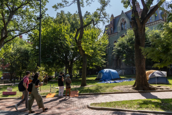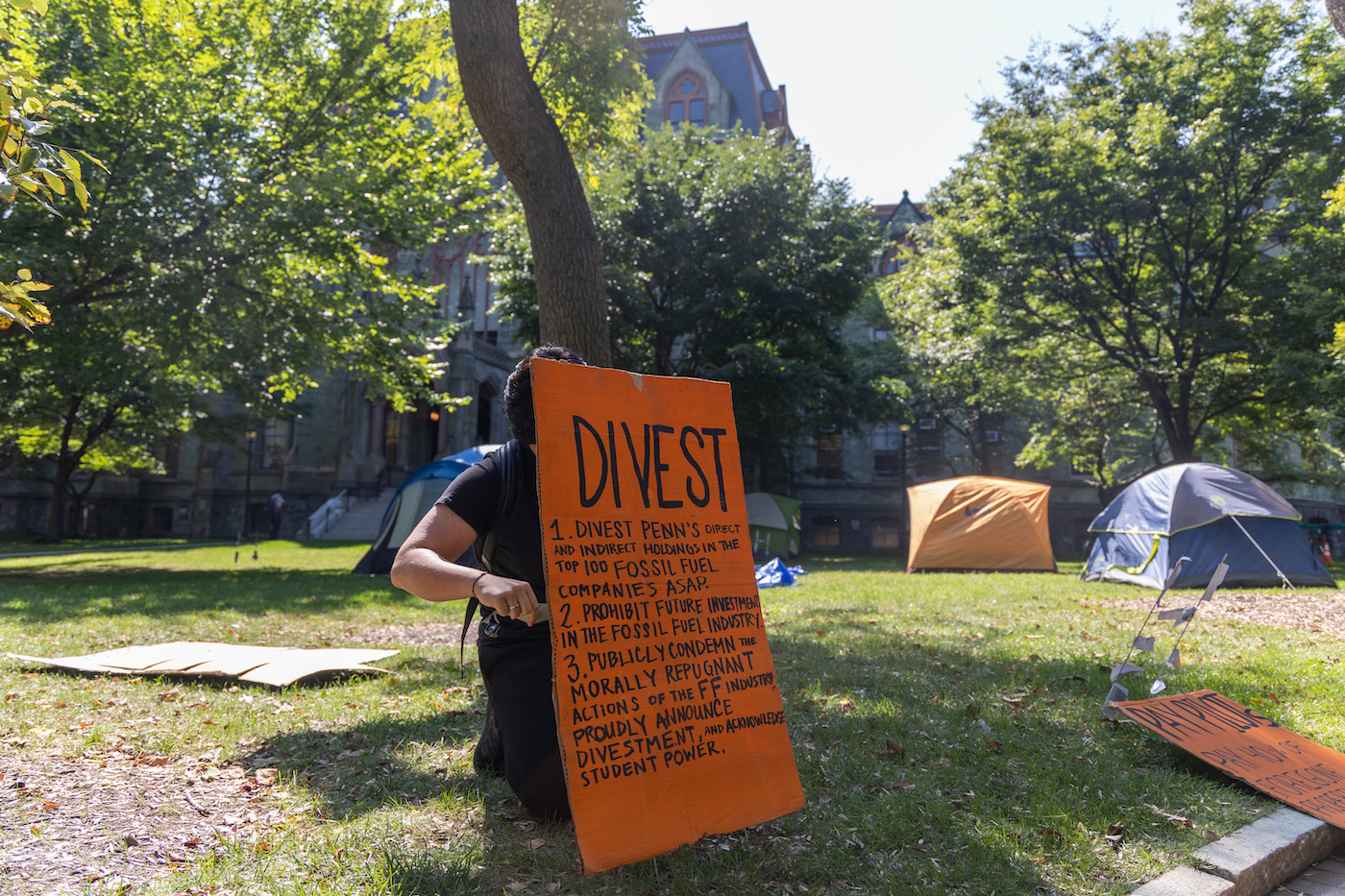 Protesters demanding the University of Pennsylvania divest from fossil fuel companies formed an encampment outside the schools administration building, camping into the morning of September 15, 2022.