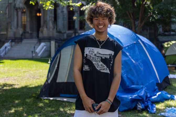 Kenny Chiu, a University of Pennsylvania student organizer with Fossil Free Penn and the UC Townhomes movement, joined an encampment protest to demand the school divest from fossil fuels on September 15, 2022.