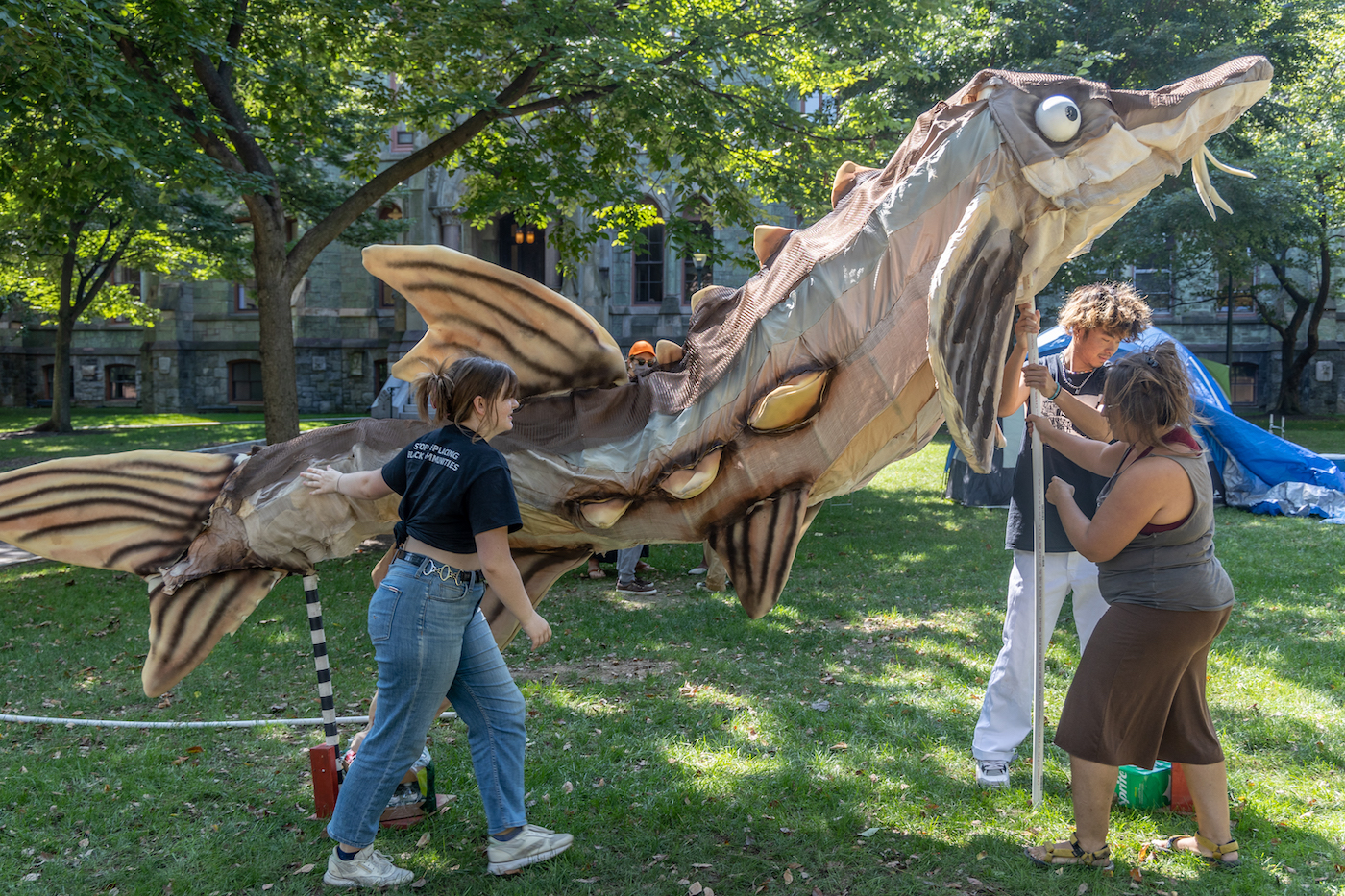 Artist Donna Oblongata from the Delaware Natural Resources Council worked with University of Pennsylvania students to install her giant endangered Atlantic sturgeon at a protest encampment on campus demanding the school divest from fossil fuels in September 15, 2022.