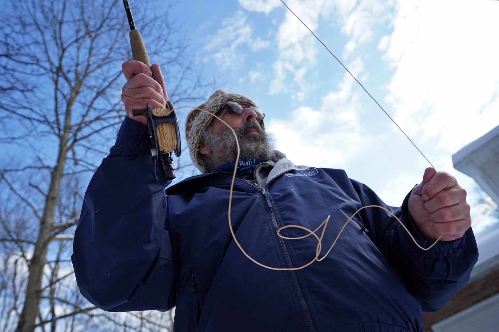 Steve Schwartz demonstrates fly fishing technique in front of his home in Equinunk, Pennsylvania. (Matt Smith/WHYY)