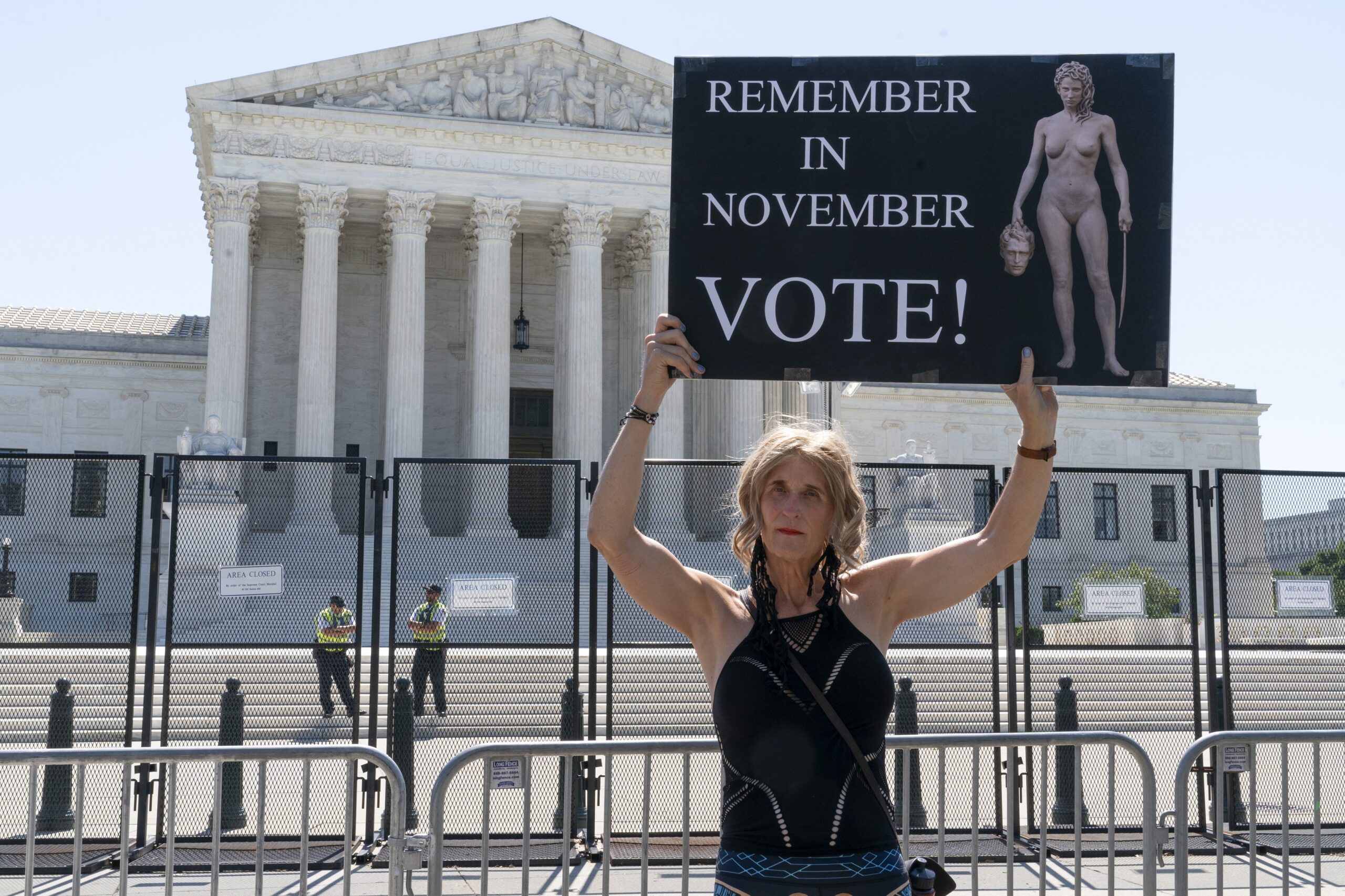 Nicky Sundt, of Washington, holds a sign with an image depicting Medusa that says, “Remember in November, Vote!,” outside of the Supreme Court, June 29, 2022, in Washington.