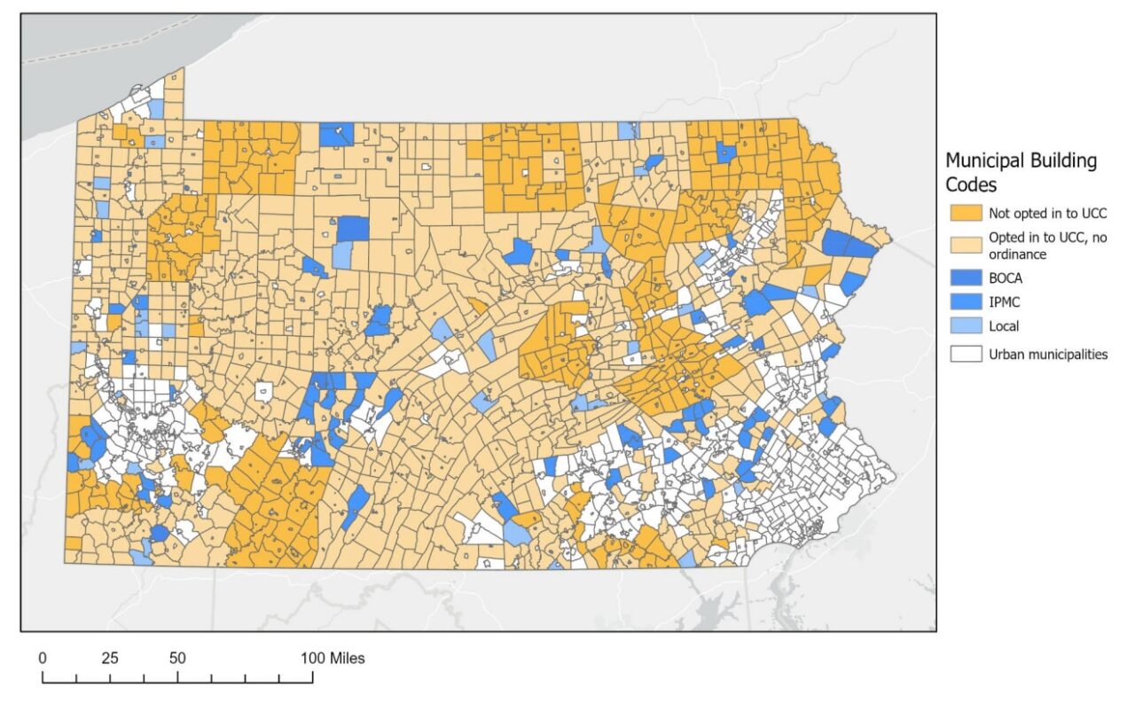 Map of municipal building and property maintenance codes in Pennsylvania.