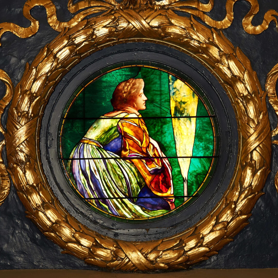 A stained glass window personifying Pennsylvania's natural gas industry in the Pennsylvania House Chamber. The window is one of 24 designed by artist William Brantly Van Ingen.