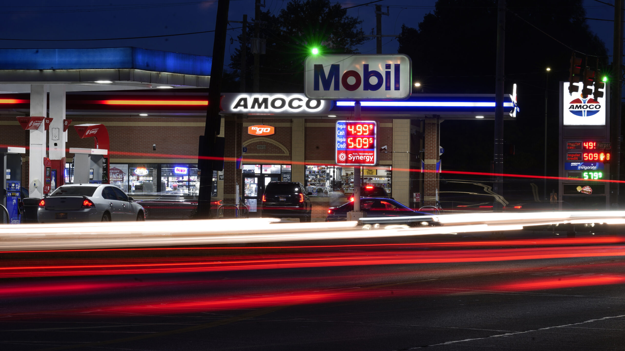 File – Motorists stop for fuel at gas stations in Detroit, Tuesday, July 5, 2022. If the auto industry boosts electric vehicle sales to the level the Environmental Protection Agency recommends, any reduction in pollution could prove more modest than the agency expects. The Associated Press has estimated that nearly 80% of vehicles being driven in the U.S. — more than 200 million — would still run on gasoline or diesel fuel. (AP Photo/Paul Sancya, File)