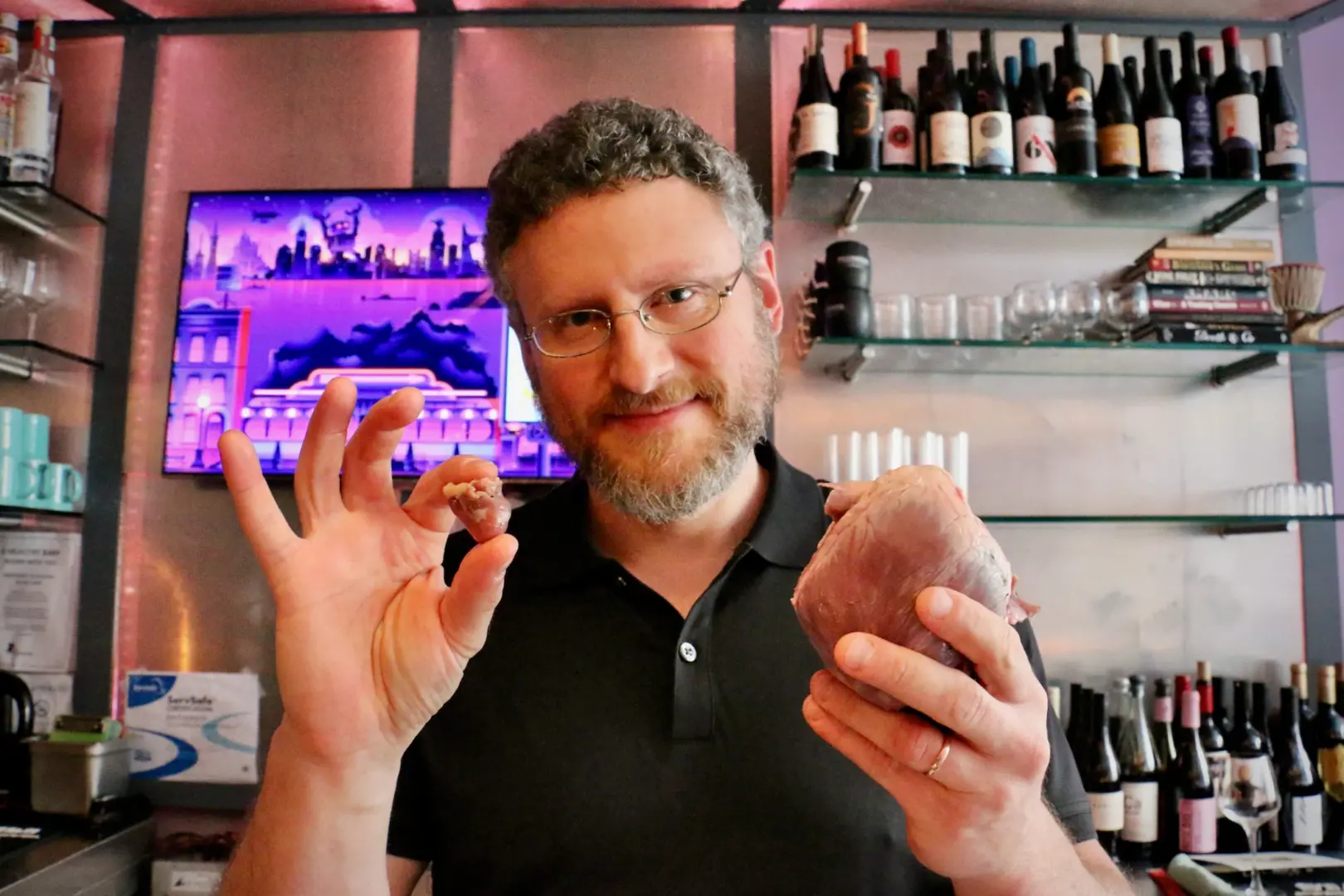 Dr. Jonathan Reisman holds up a chicken heart and a pig heart for comparison at Jet Wine Bar in South Philadelphia, where he gave a talk on organ meats during the bar's Offal Wine and Dine event.