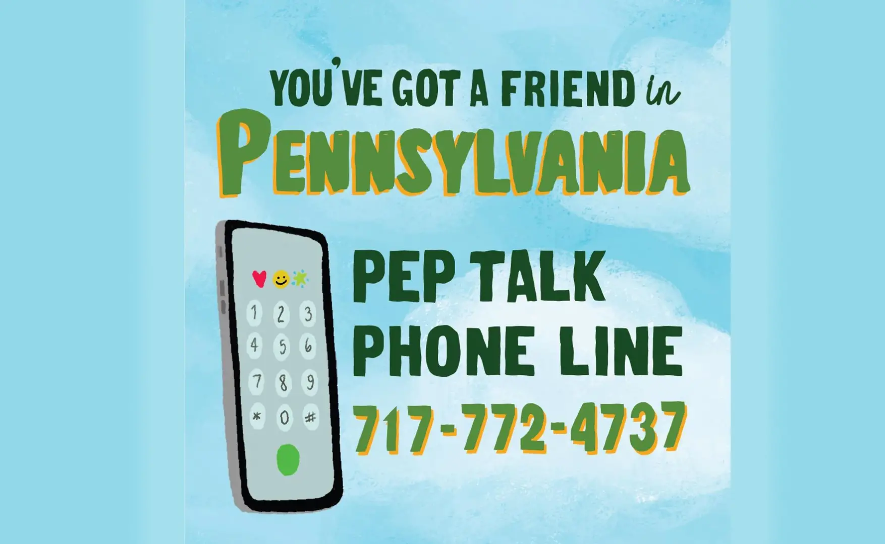 The “You’ve Got a Friend in Pennsylvania Pep Talk Phone Line” is free and automated. The number is (717) 772-4737. That spells 717-PRAISES, for when you need some praises.
