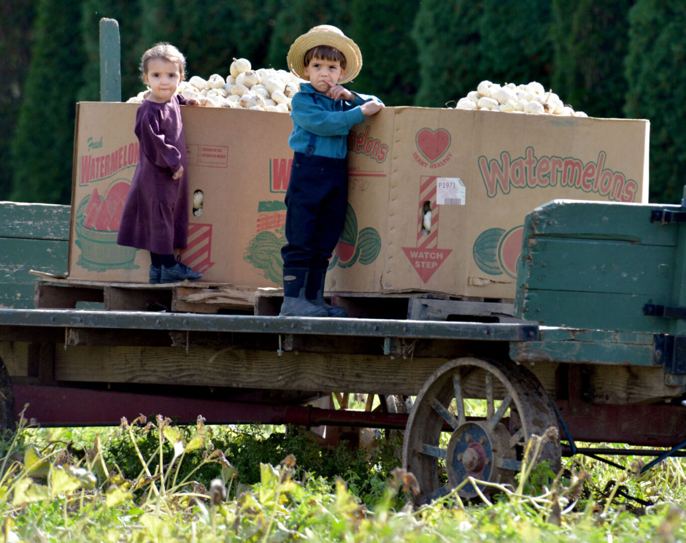 An Amish boy and girl watch other family members load small pumpkins on a wagon off East Eby Road in this 2015 file photo. Amish children are the people most likely to die in farm accidents in Lancaster County.