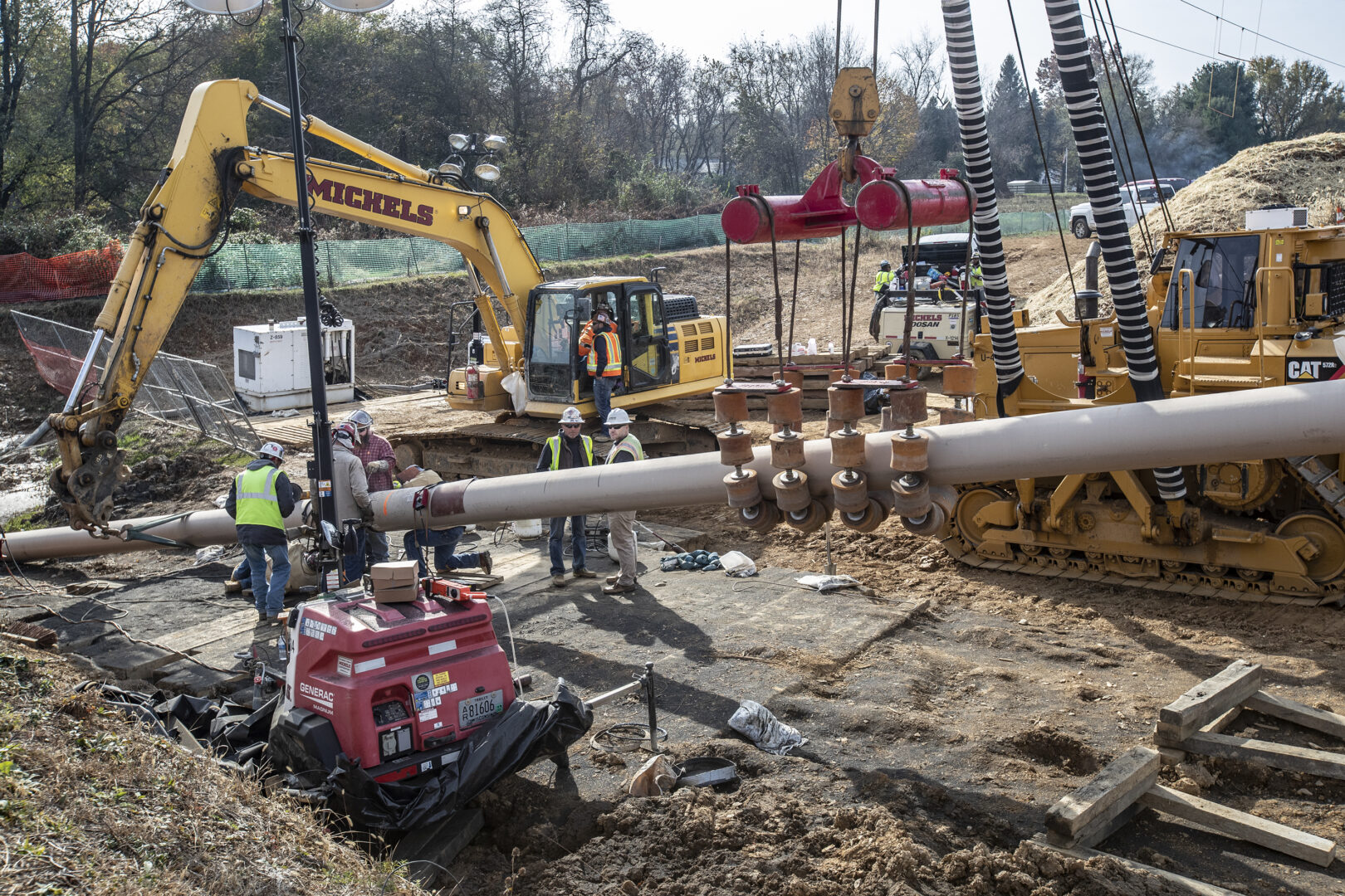 Pipe fiters, left, work to connect a long segment of pipe that is being suspended in air to make it ready to be pulled undergroud in a residential area of West Chester, PA on Ship Road and South Pullman Drive as part of the Mariner East Pipeline that is going through the area on Novemnbere 11, 2019. The Mariner East pipeline is continuing to be constructed in Delaware and Chester Counties by Sunoco Energy Transfer Partners, much to the consternation of many of the residents of the area