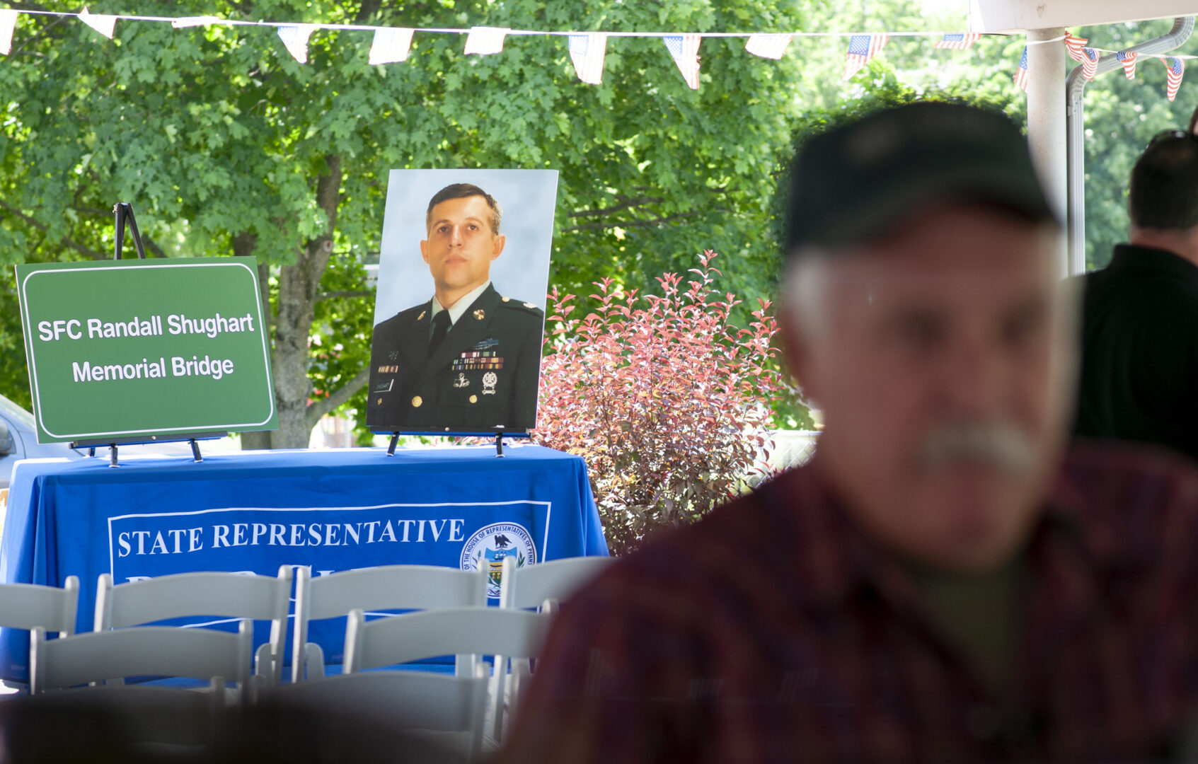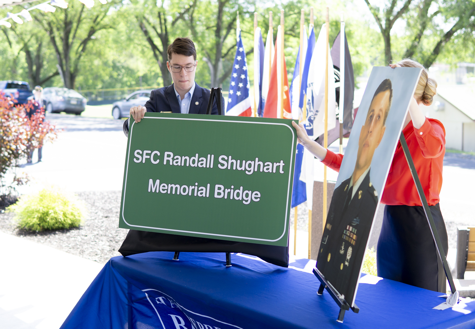 Shughart’s younger brother Mike Shughart was in attendance. He accepted a framed copy of the bill dedicating the bridge, a copy of the sign and two flags.