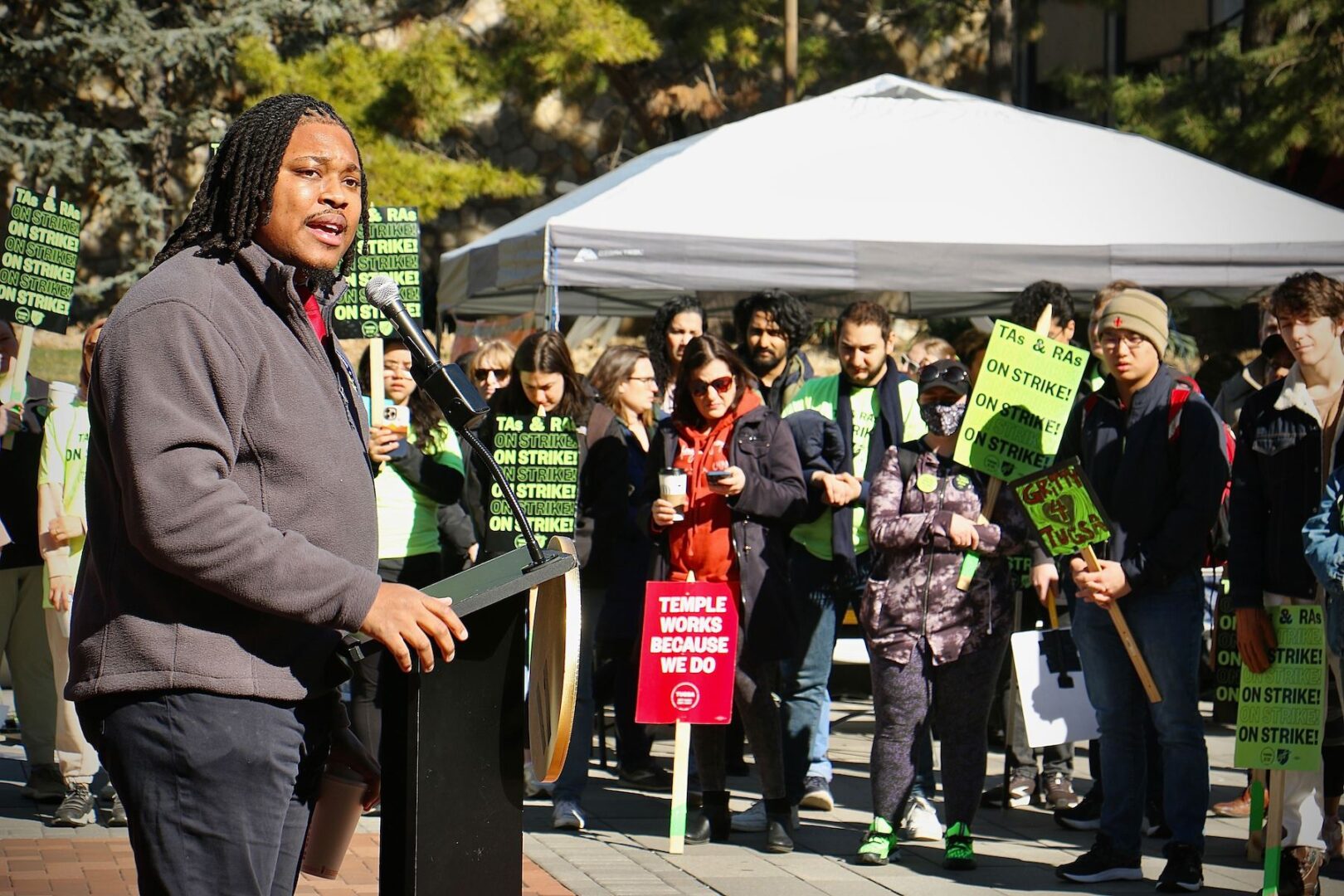 Pennsylvania state Rep. Malcolm Kenyatta speaks at a rally and march for Temple University graduate students, who are asking for higher wages. (Emma Lee/WHYY)