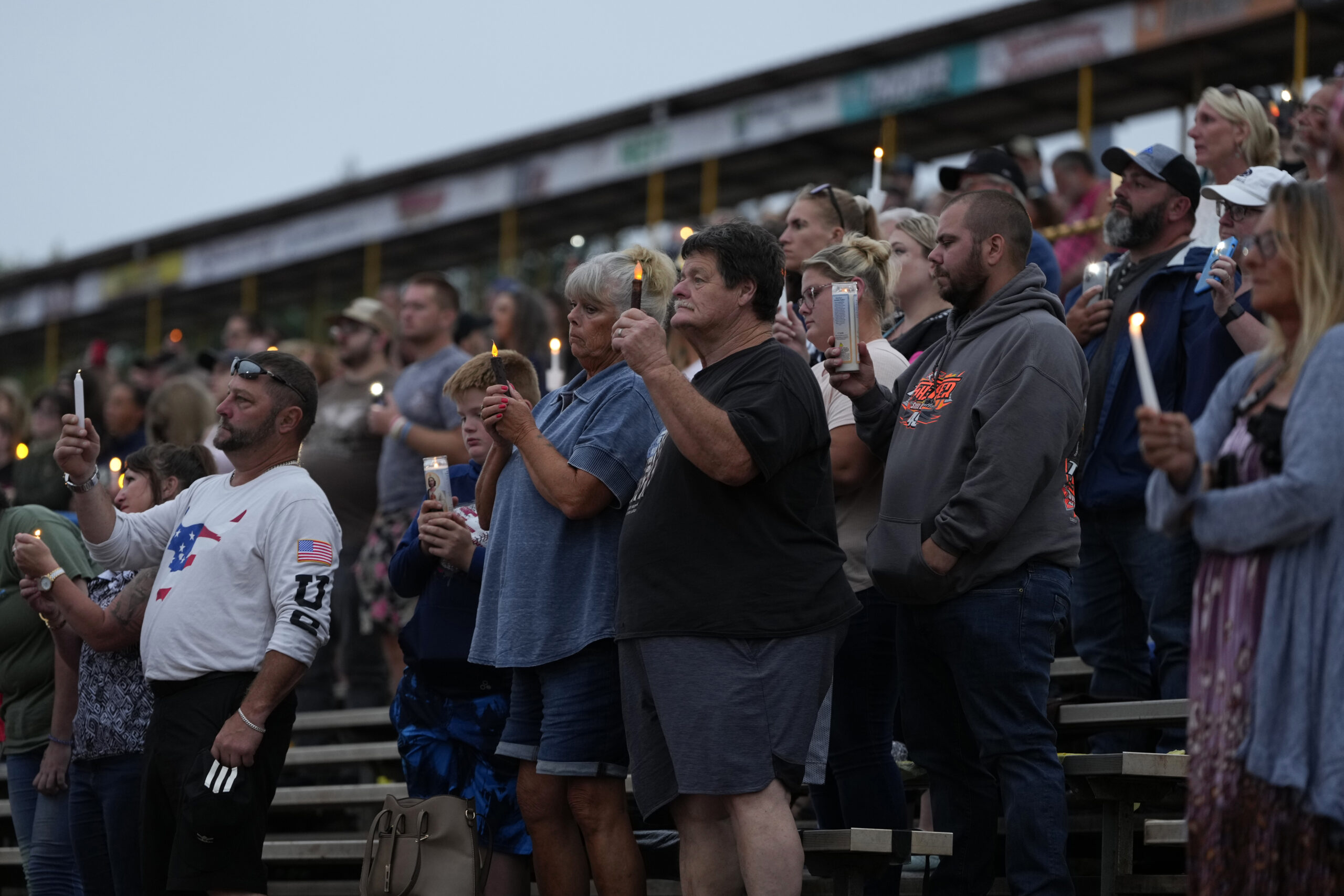 A woman holds a candle during a vigil for Corey Comperatore, Wednesday, July 17, 2024, at Lernerville Speedway in Sarver, Pa. (AP Photo/Matt Slocum)