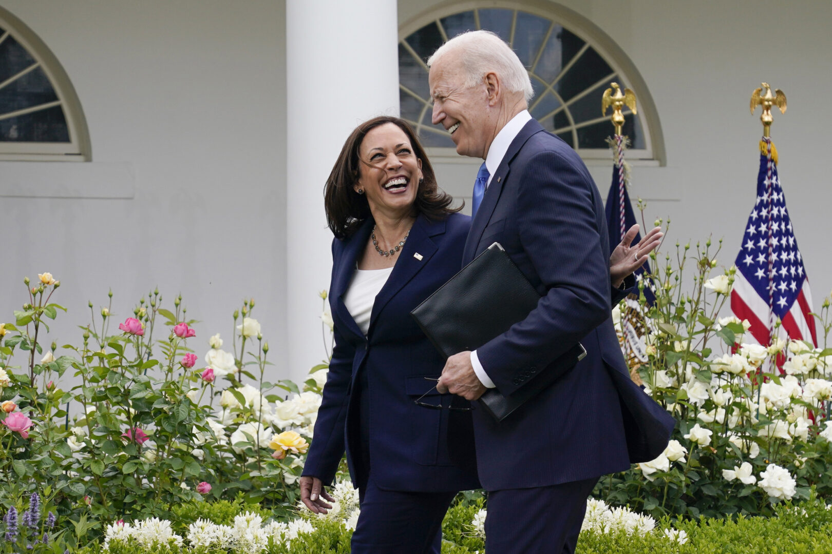 FILE - President Joe Biden, right, walks with Vice President Kamala Harris after speaking on updated guidance on face mask mandates and COVID-19 response, in the Rose Garden of the White House, May 13, 2021, in Washington. President Joe Biden dropped out of the 2024 race for the White House on Sunday, July 21, ending his bid for reelection following a disastrous debate with Donald Trump that raised doubts about his fitness for office just four months before the election. (AP Photo/Evan Vucci)