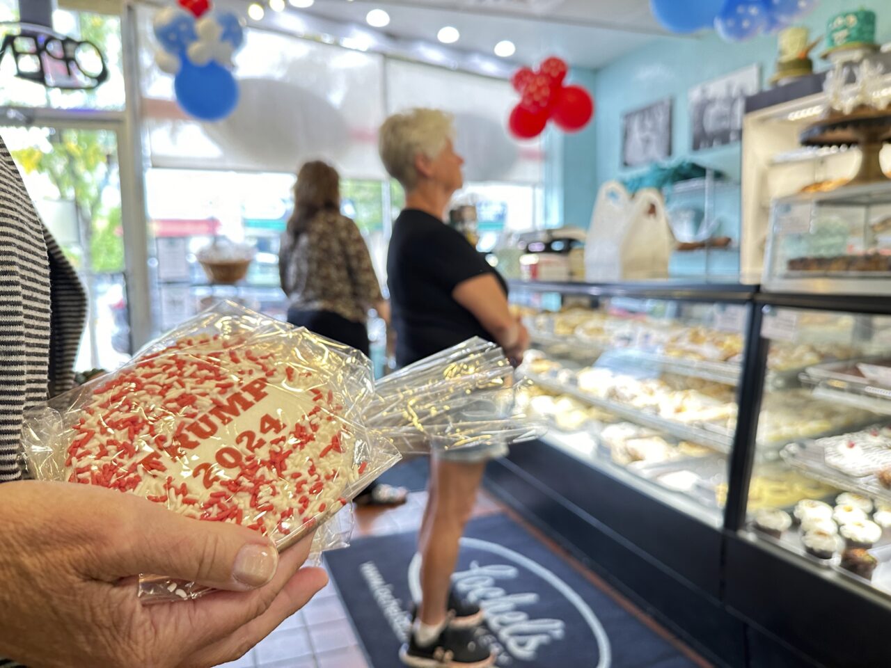 The bakery sells 4-inch round sugar cookies, one with blue and white sprinkles and a Harris 2024 label on it and the other with red and white sprinkles and a Trump 2024 label on it.