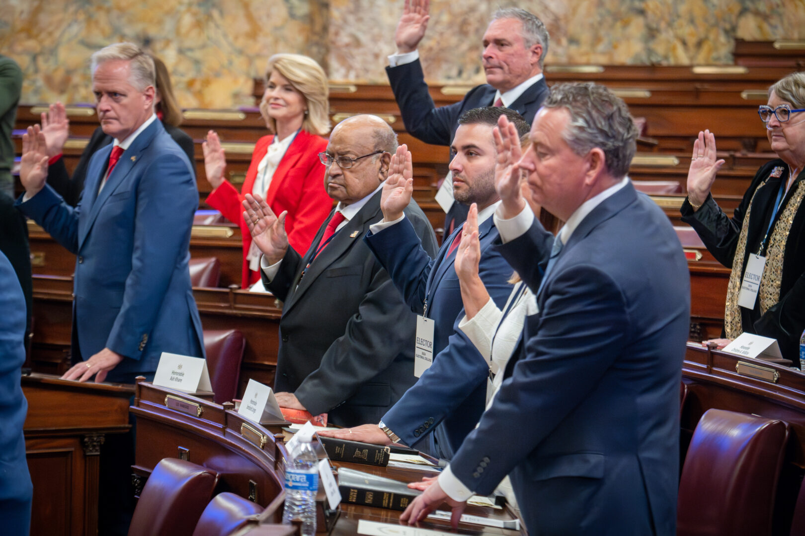 Pennsylvania’s electors take their Oath of Office during a meeting of Electors in the Electoral College in the House Of Representatives chamber of the Pennsylvania Capitol Tuesday, Dec. 17, 2024 to cast their votes for president and vice president in the 2024 election.