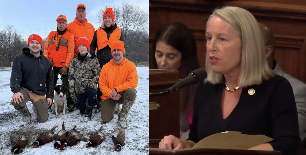 Rep. Mandy Steele (D-Fox Chapel) is pictured hunting pheasants in December with family and members of the Game Commission. On June 30, she addressed colleagues on the House floor in Harrisburg (right).