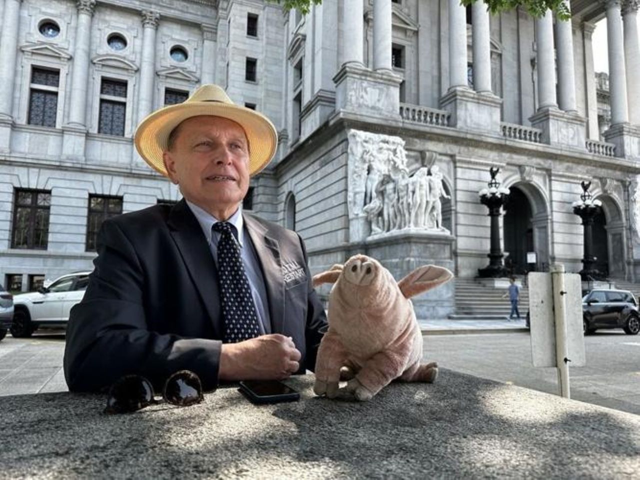Activist Gene Stilp speaks to a reporter outside of the state Capitol building in Harrisburg on June 5, 2025, just 50 feet away from where he flew a large inflatable pig in 2005 to protest the pay raise lawmakers gave themselves in an early morning vote.