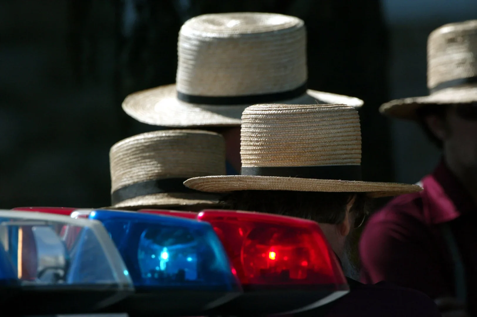 Amish hats are seen behind the lights of a police car Oct. 2, 2006, after the West Nickel Mines School shooting in Bart Township. The school was an Amish one-room schoolhouse in the Old Order Amish Community of Nickel Mines.