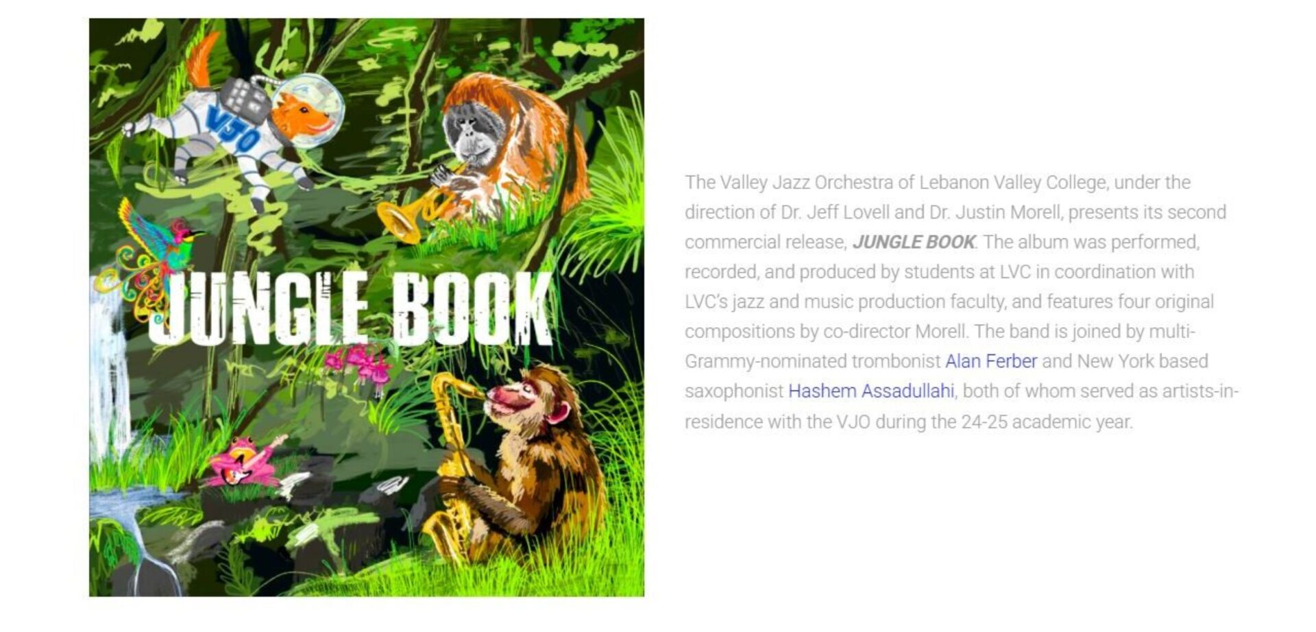 With Jungle Book, the Lebanon Valley College Jazz Orchestra continues to push the boundaries of collegiate jazz, giving students an opportunity to perform, record, and learn from world-class musicians while producing an album that resonates with contemporary jazz audiences.