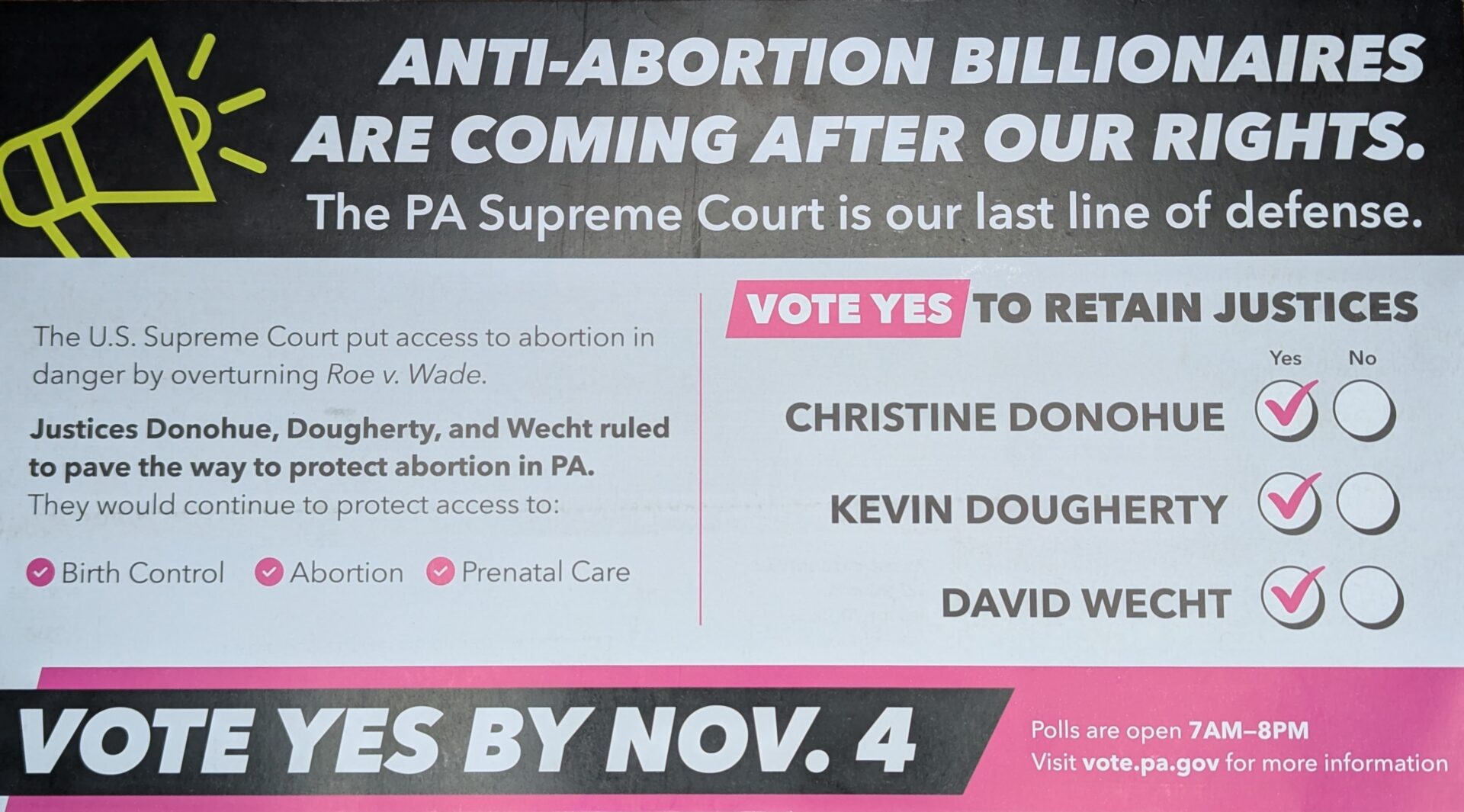 Planned Parenthood Action Fund, the reproductive health provider’s political arm, has said it plans to spend six figures on a mailer campaign aimed at convincing Pennsylvanians to retain the three judges. The mailer says “anti-abortion billionaires are coming after our rights,” calling the state Supreme Court the “last line of defense.”