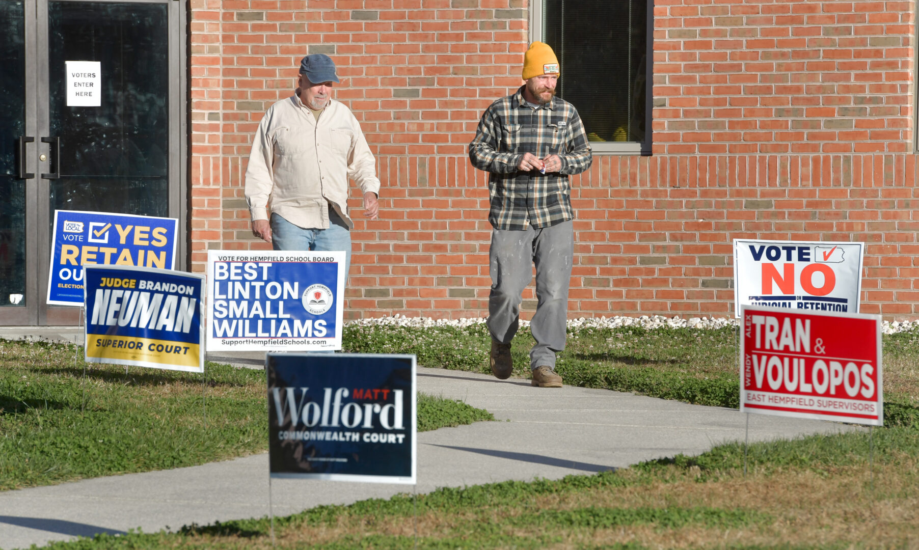 From the left, Bill Benninger and Marlin Straub exit their polling place after voting at the Hempfield Brethren in Christ Church in Lancaster on Tuesday, Nov. 4, 2025.