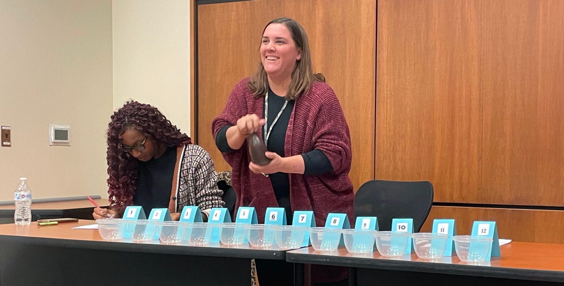 Christa Miller, Lancaster County’s election director, shakes a bottle filled with red, numbered marbles to determine the winner of tied races.