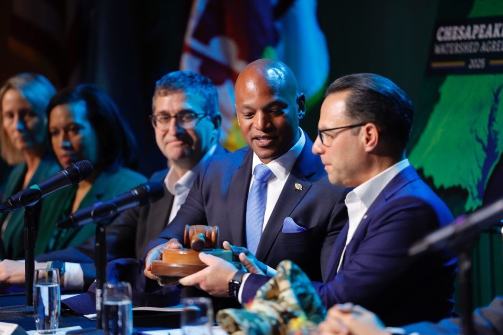 Maryland Gov. Wes Moore hands Pennsylvania Gov. Josh Shapiro the Chesapeake Executive Council gavel. Shapiro was elected on Dec. 2, 2025, by the group's nine members to serve as chair for the next year.