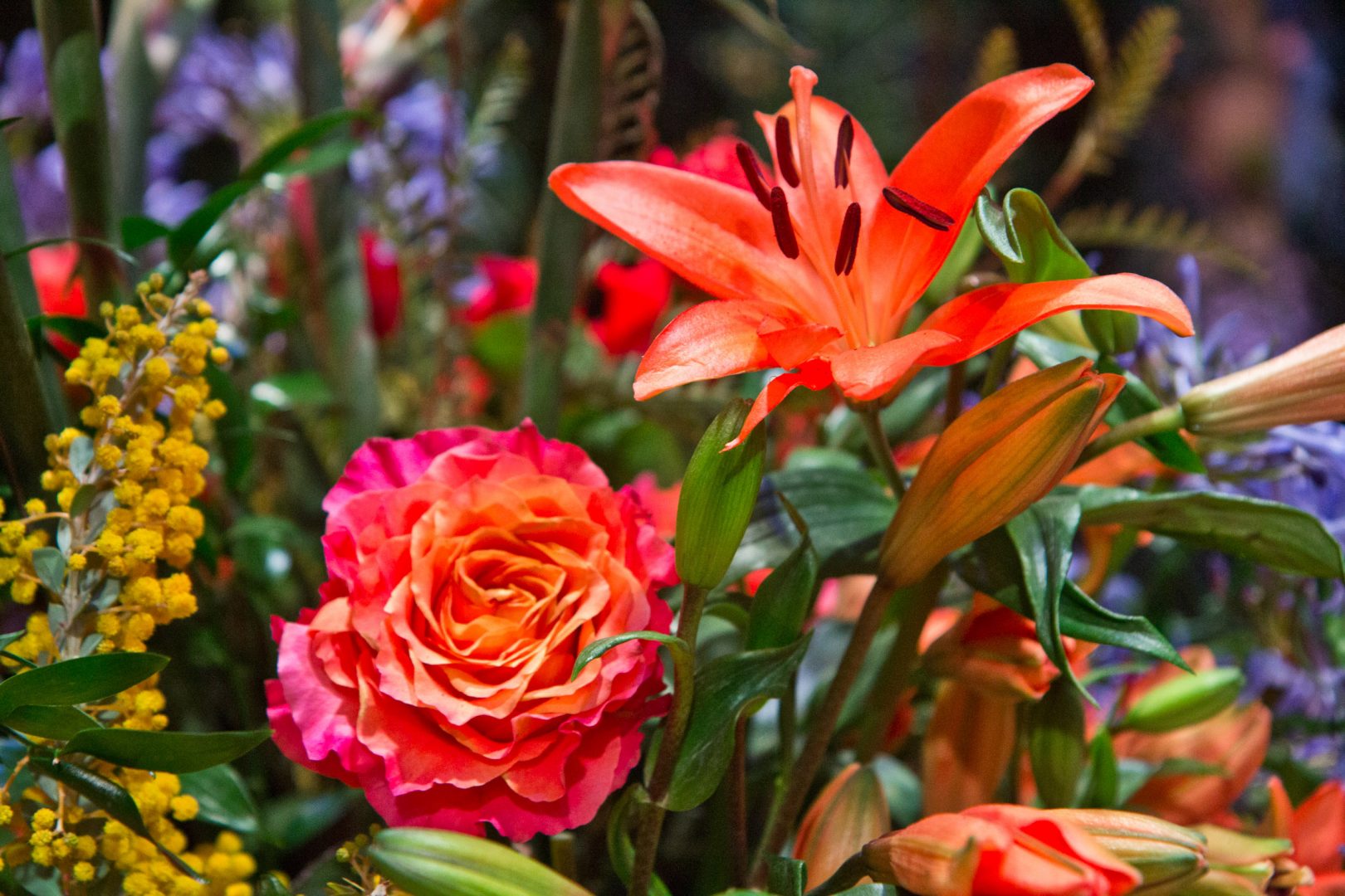 Flowers atop the main exhibit of the 2020 Philadelphia Flower Show, themed “Rivera Holiday.”